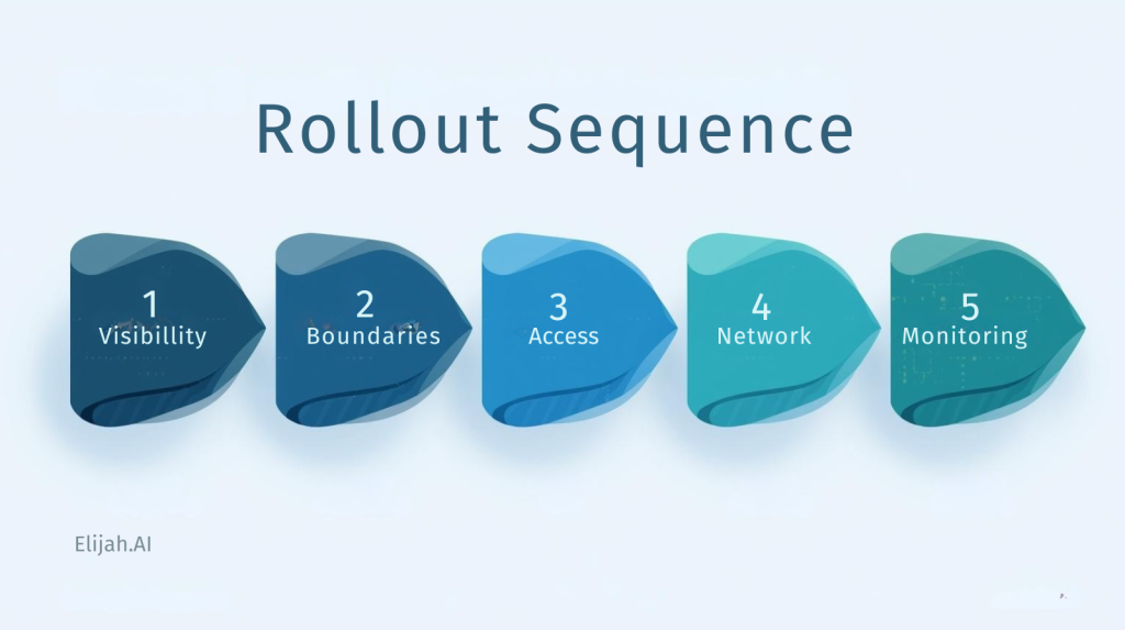 Order of implementation: Visibility first (who has what, where). Then data boundaries (DLP, tenant isolation). Then access tightening (roles, conditional access). Then network controls where required. Then continuous monitoring (audit, security score, recommendations). Microsoft’s Security overview surfaces recommendations you can act on.